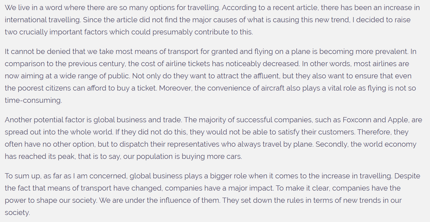 To sum up, as far as I am concerned, global business plays a bigger role when it comes to the increase in travelling. Despite the fact that means of transport have changed, companies have a major impact. To make it clear, companies have the power to shape our society. We are under the influence of them. They set down the rules in terms of new trends in our society (I think you could combine the final two sentences and avoid repeating the words ‘our society’).