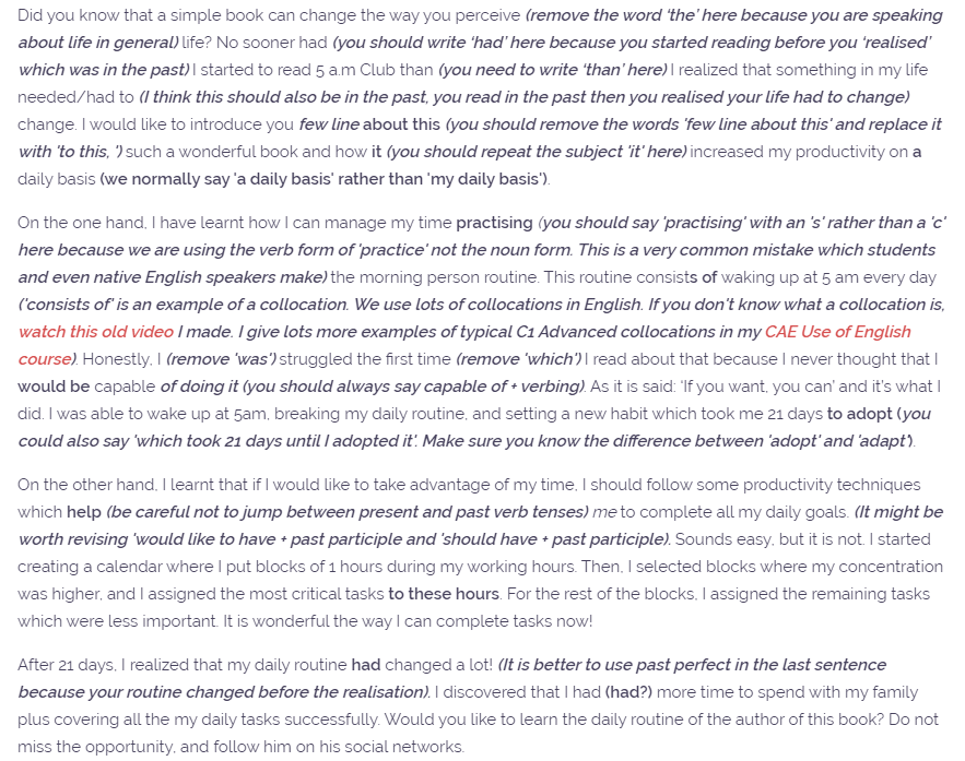 On the one hand, I have learnt how I can manage my time practising (you should say 'practising' with an 's' rather than a 'c' here because we are using the verb form of 'practice' not the noun form. This is a very common mistake which students and even native English speakers make) the morning person routine. This routine consists of waking up at 5 am every day ('consists of' is an example of a collocation. We use lots of collocations in English. If you don't know what a collocation is, watch this old video I made. I give lots more examples of typical C1 Advanced collocations on my website). Honestly, I (remove 'was') struggled the first time (remove 'which') I read about that because I never thought that I would be capable of doing it (you should always say capable of + verbing). As it is said: ‘If you want, you can’ and it’s what I did. I was able to wake up at 5am, breaking my daily routine, and setting a new habit which took me 21 days to adopt (you could also say 'which took 21 days until I adopted it'. Make sure you know the difference between 'adopt' and 'adapt').